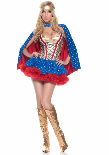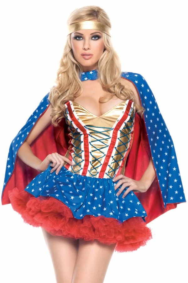 3 Piece HERO GIRL includes Bustier with attached skirt, headband, reversible cape