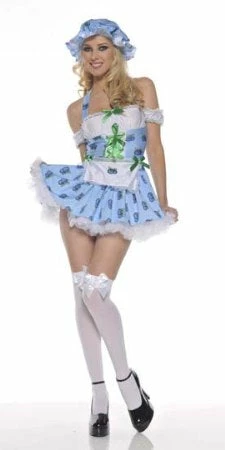 Blueberry Delight Costumes includes an off the shoulder dress, and hat apron. White Thigh-highs and white petticoat are included. Shoes are sold separately.