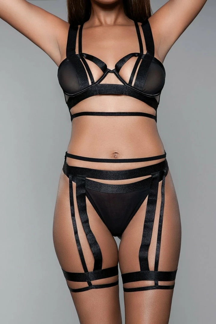 2 pc set. A superfine soft mesh bralette with edgy cut-outs on the cup with double adjustable straps. Matching thigh harness and sheer panty included (1959 panty not included).