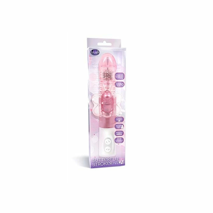 A small version of the ever-popular Butterfly Stroker Mini V2 excels in function design. The shaft thrusts while three rows of pleasure beads rotate powerfully inside. Simultaneously the soft butterfly stimulator vibrates with 7 different functions. The butterfly’s antennae and wings are specially designed to reach all the right spots. The slim and discreet size makes this dual stimulation vibe less bulky than similar products. 3 AAA Batteries