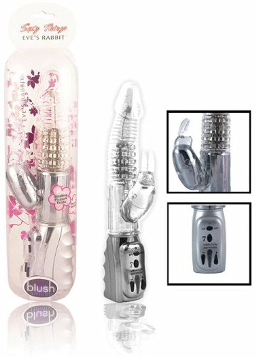 The Eve’s Rabbit Vibrator from Blush is a sturdy, silent vibrator with powerful and quiet motors. The rotating shaft features 4 rotating speeds, 5 rows of non jamming pleasure pearls, and a clitoral stimulator with 7 vibrating functions. Rabbit Vibrator is made using phthalate free, non-toxic and latex free material Thermoplastic Resin TPR. Soft and sensual vibrating sex toy measures 10 inches long with an insertable length of up to the clitoral stimulator or about 5.5 inches. Vibrator is powered by standard alkaline batteries. 4 AA batteries, not included. For best results always remove batteries between uses.