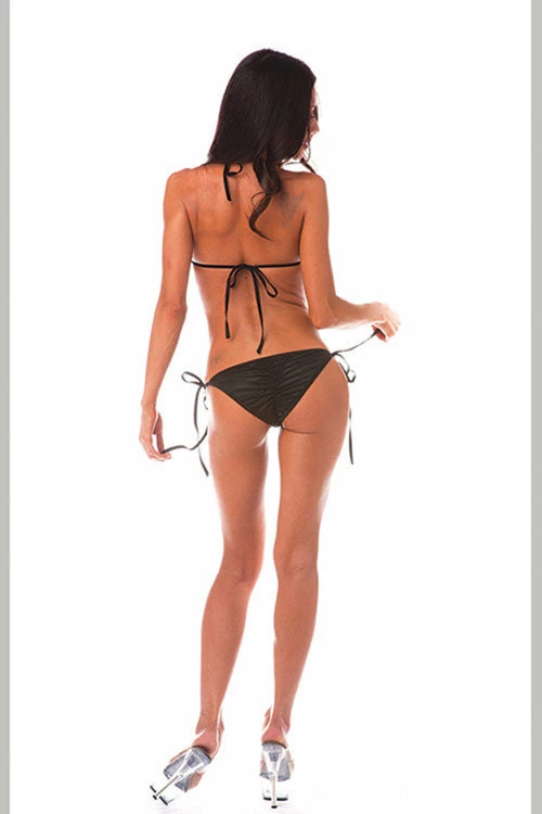 Adjustable Tie Sides with scrunch butt bottoms, Adjustable halter tie around neck, and Adjustable tie in back.