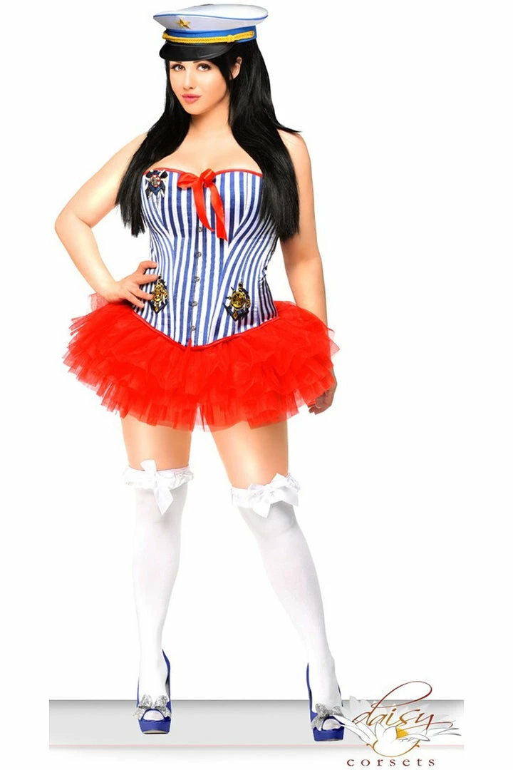 Costume includes corset with front busk closure, lace-up back for cinching and matching thong; Petticoat; and Hat.