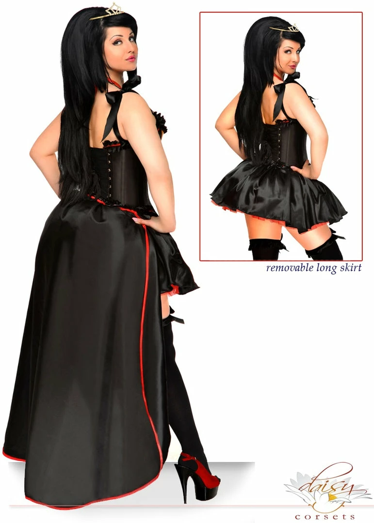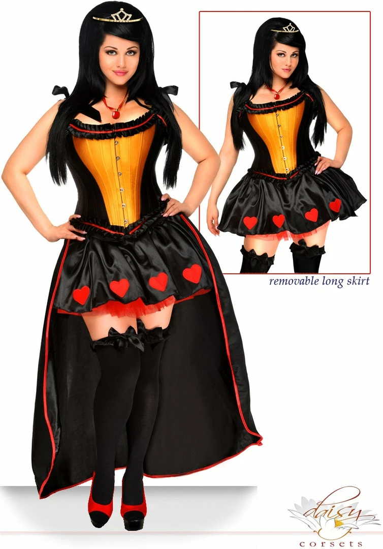 Costume includes steel boned corset with front metal closure, satin tie straps, removable garters and lace-up back for cinching; Satin skirt with red tulle underlay; Detachable long satin skirt; Gold Tiara; Heart Necklace.