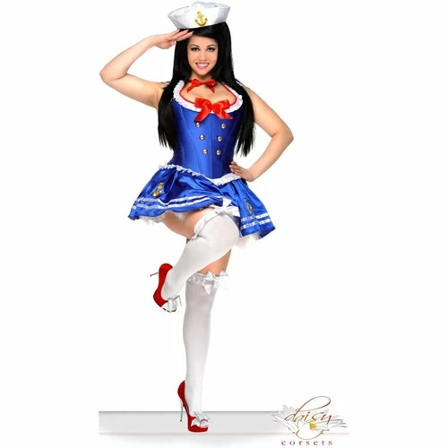 Costume includes satin halter top corset featuring gold button accents, ruffle trim, side zipper closure and lace up back for cinching, removable sailor cape, hat and satin skirt with gold anchor appliques and white tulle underlay.