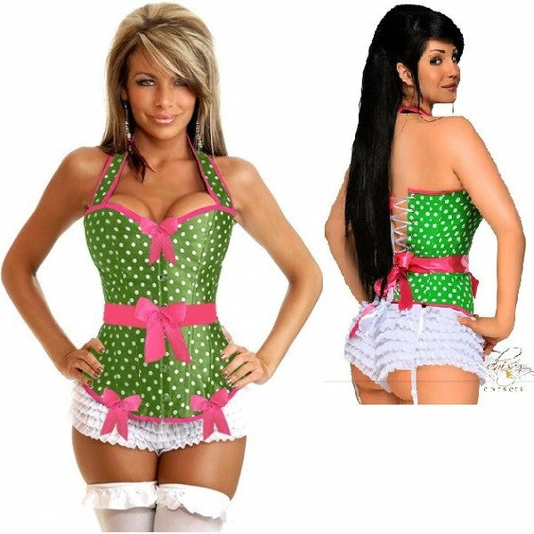 Halter top corset with white polka pattern that ties behind the neck with front busk closure, lace-up back for cinching, and a matching thong. Comes with removable bow belt. Ruffle panty sold separately.