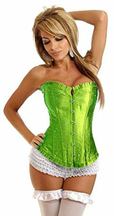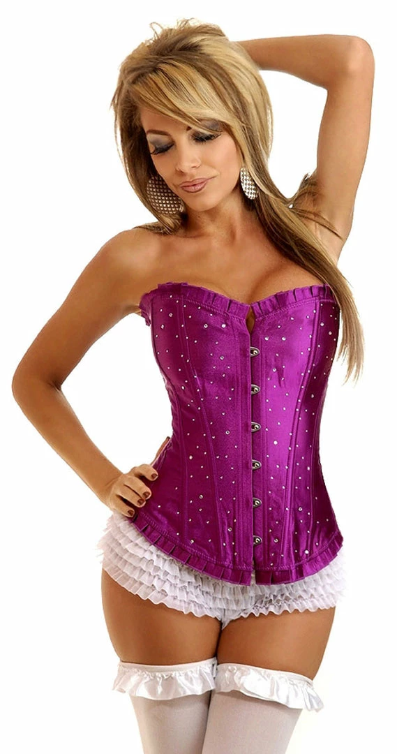 Sexy strapless sparkle corset with ruffle trim, front busk closure, lace-up back and matching g-string.