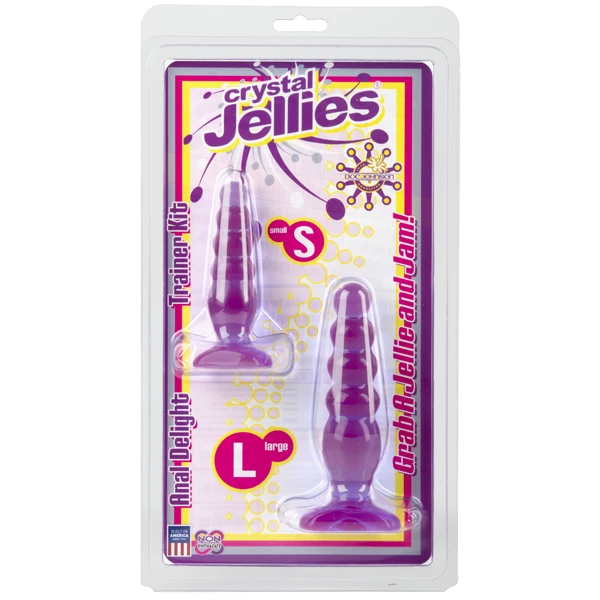 Explore your backdoor with confidence! With a small and medium plug, the Crystal Jellies Anal Trainer Kit is the perfect fit for anal play beginners. The small plug is 3.5” in diameter with 3.75” insertable length, the large plug is 4.25” in diameter with 4.75” insertable length. These plugs feature a wide flared base for safe and comfortable anal play. Crystal Jellies are made from phthalate-free body safe material, which includes Doc’s antibacterial Sil-A-Gel formula. Proudly made in America.