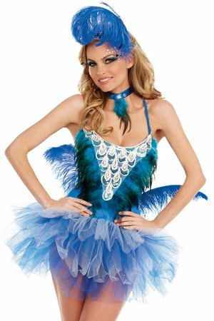 Corset style dress with elaborate sequin and feather applique;with multilayered tutu skirt. Includes removable feather tail, matching headpiece and choker. (4 piece set)