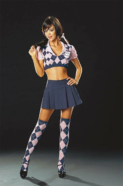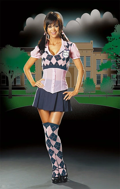 Argyle knit top with attached chiffon collar, sleeves and removable lower blouse. Includes pleated skirt and matching argyle knit knee socks. (3 piece set). Made of 100% polyester chiffon, sweater 97% polyester 3% spandex, skirt 100% cotton.
