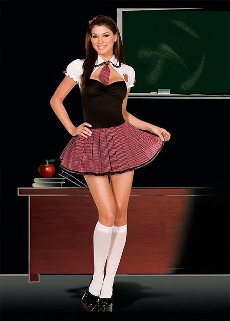 Stretch knit dress with attached collar and plaid necktie, pleated skirt and lace hem. Includes matching headband with plaid bow. (2 piece set)
