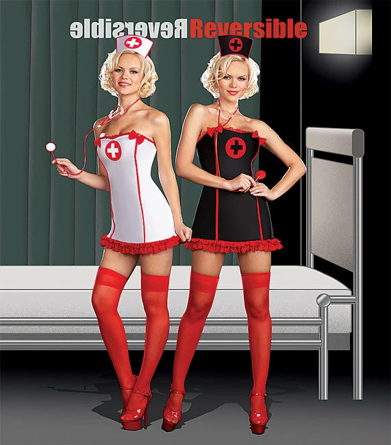 Fully reversible Good Nurse/Bad Nurse stretch knit dress with contrast piping, heat transfer cross detail and ruffles at hem and neckline. Includes removable, adjustable shoulder straps, two bow pins, nurse hat and stethoscope. (5 piece set) REVERSIBLE. Made of 94% polyester 6% spandex.
