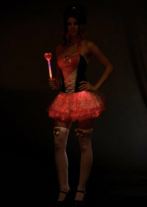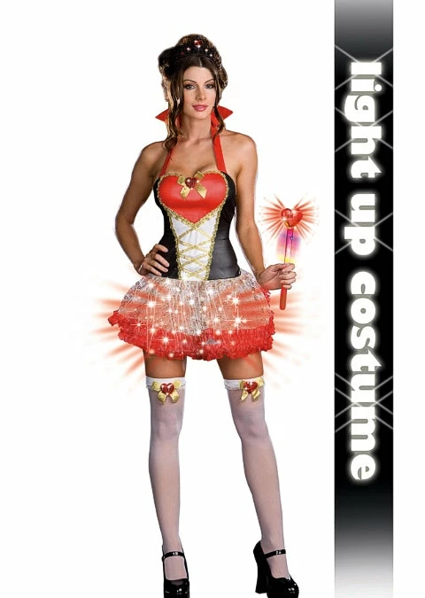 Stretch knit adjustable halter dress with stand up collar, gold brocade faux lace-up detail and heart glitter print multi layered petticoat skirt. Skirt has red unique fiber optic lights with hidden pocket for on/off switch. Includes tiara with red heart jewels, heart shaped scepter with lights and 2 leg garters with sequin heart detail. Batteries included. (5 piece set) light up. Hearts beware; this Queen will break you with just one stare.