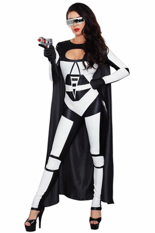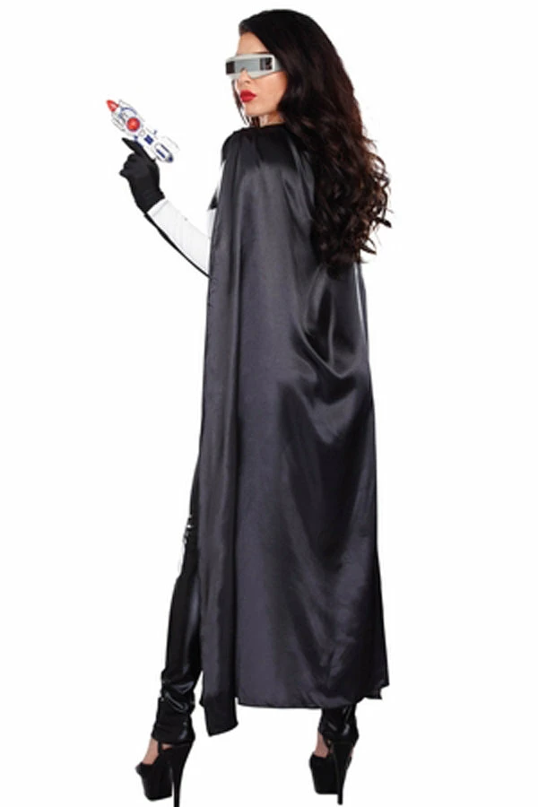 Feeling a little spacey? Time to blast off in this space suit with black and white print and attached full-length cape.(Galaxy glasses and gun not included)