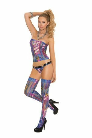 Bandeau top, matching g-string and thigh hi’s in geometric print.