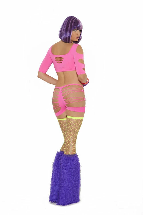 Neon Nites shredded 3/4 sleeve top with matching booty shorts.