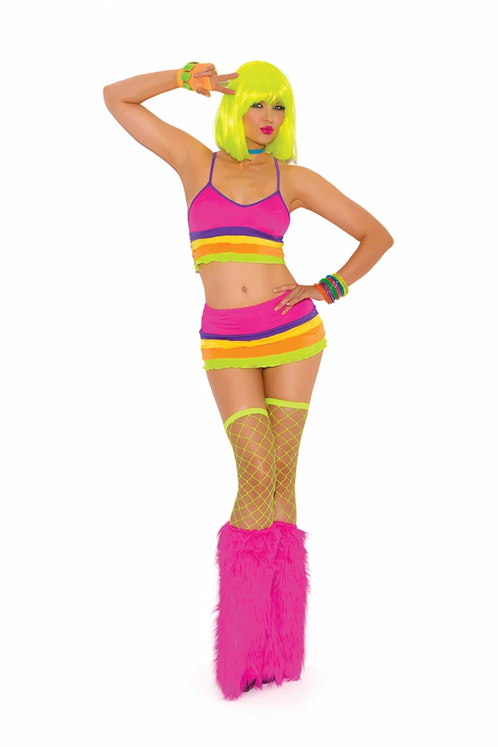 Neon pink bra top with matching layered neon ruffle trim, adjustable straps and matching mini skirt with neon ruffled trim. .