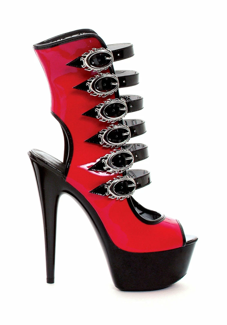 Peep toe sling back calf high boot with 6 ornate buckle straps, 2″ platform and 6″ stiletto heel.