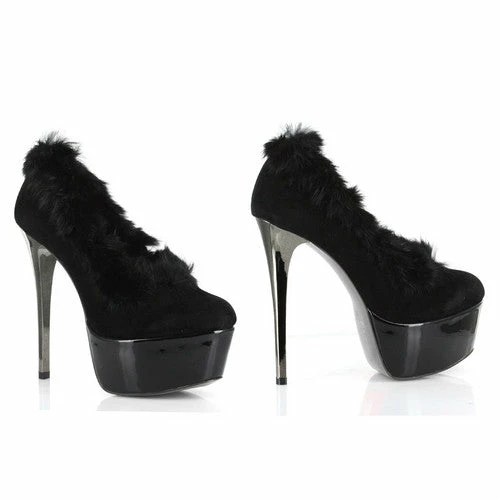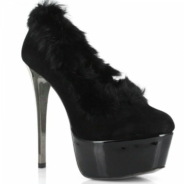Stiletto chrome heel pump with fur trim with 2″ platform and 6″ stiletto heel.