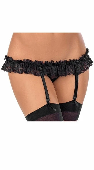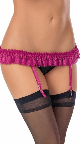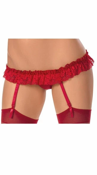 Make this sexy garter belt a staple in your lingerie routine. Featuring a ruffled, lacy waistband, this belt includes adjustable garters with an elastic clip back.