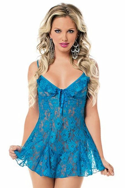 This sexy all lace chemise features a flirty flounced style hemline with ruffled lace cups, bow front and includes matching thong