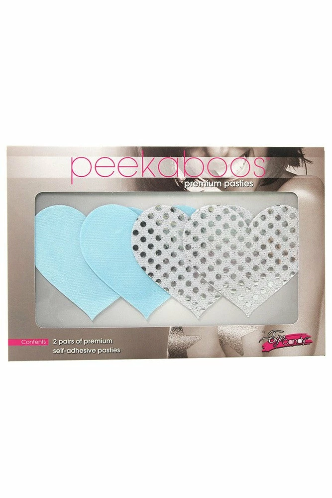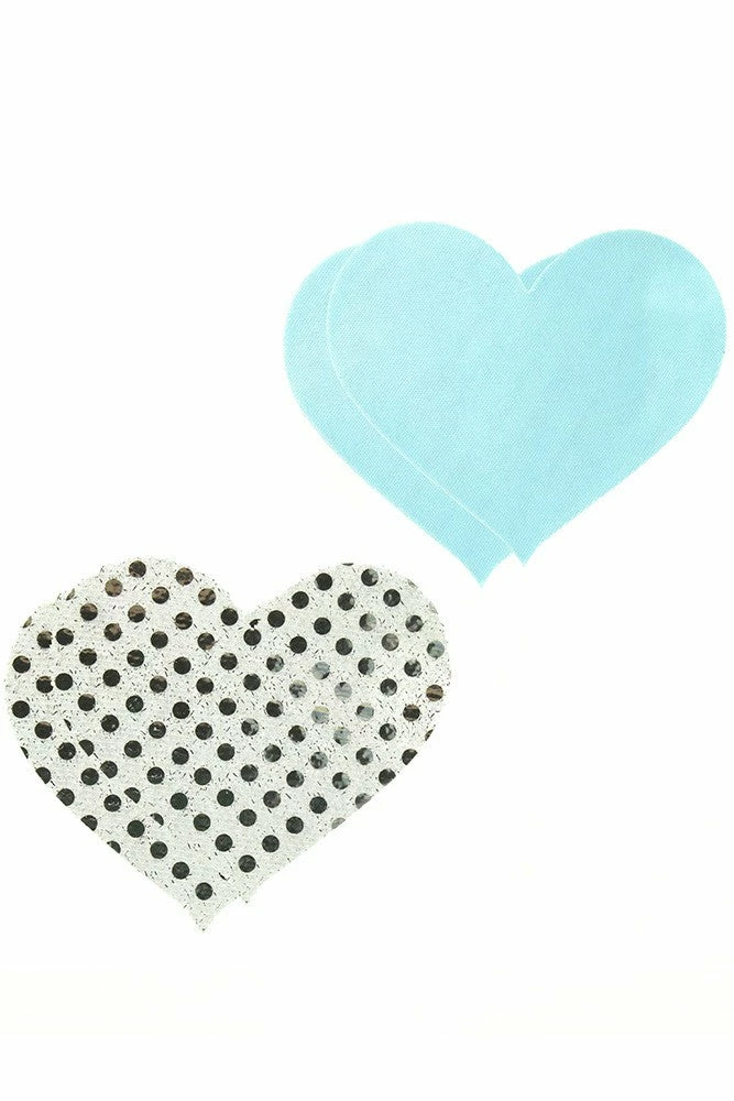 Self-adhesive heart shaped pasties include a blue set and a white with metallic dots set.