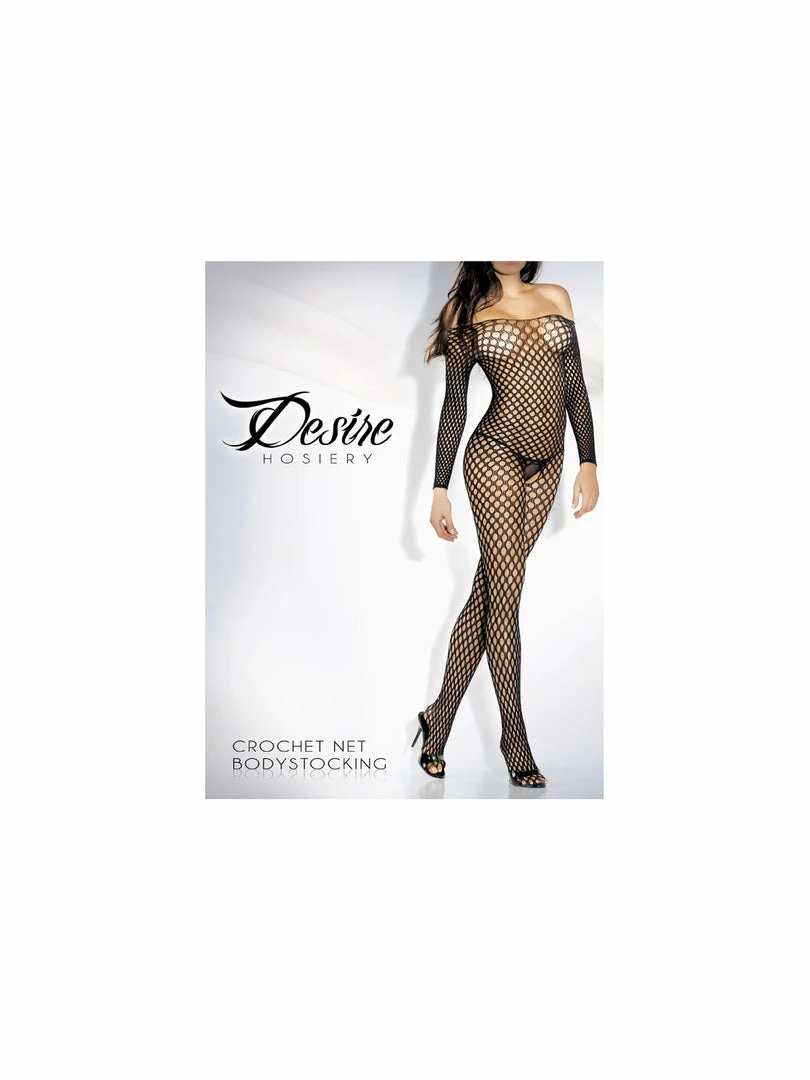 Crochet net bodystocking with long sleeve sensuous off the shoulder neckline. Made of circular crochet pattern. Elastisized wrists and neckline for a figure conforming fit.