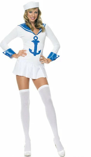 2 piece sailor cutie costume set. Includes hat and long sleeved dress with pleated skirt.