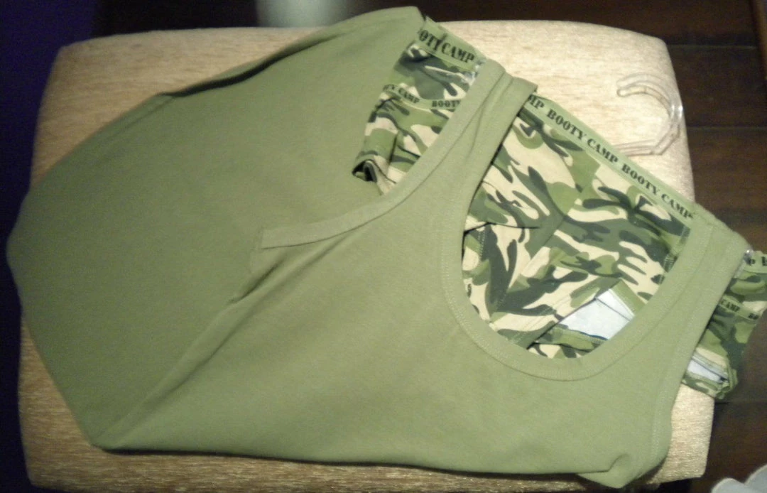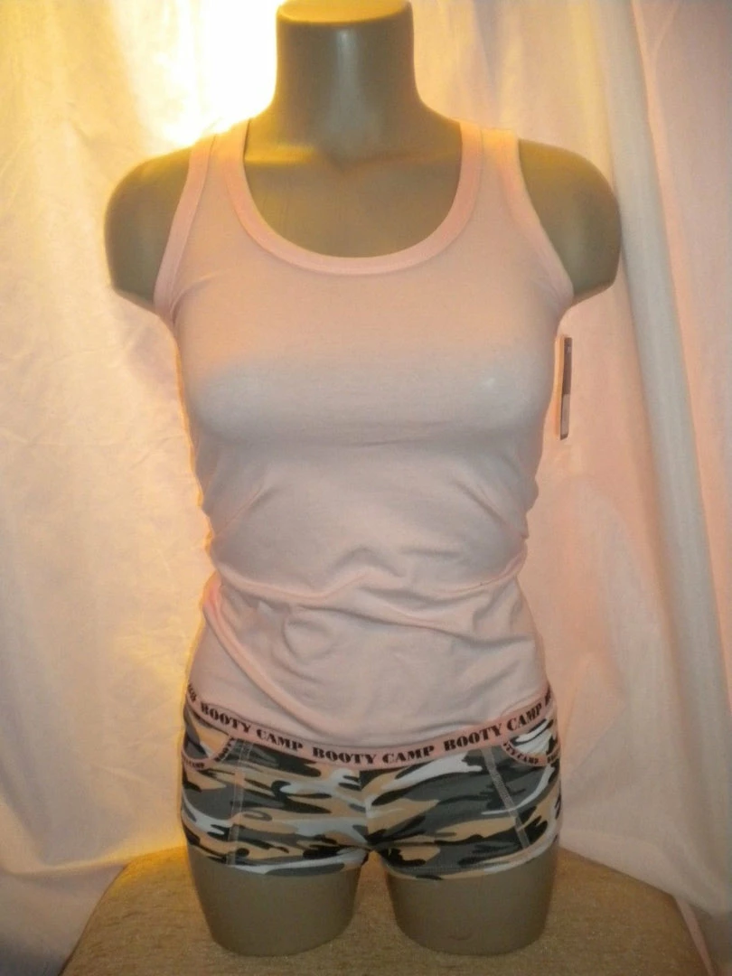 Solid color tank and camo print shorts with faux pockets and booty camp waistband