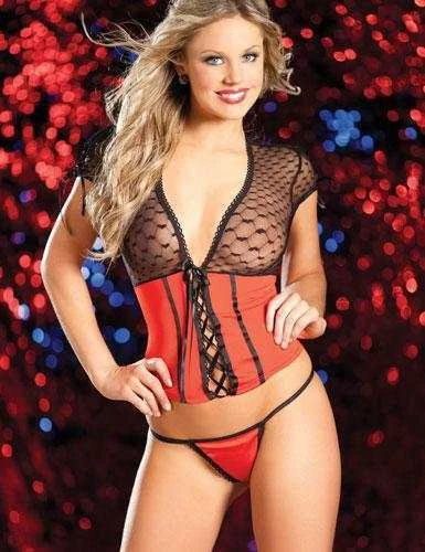 Red lycra camisole with black heart mesh trim, lace-up front, and cap sleeves.
