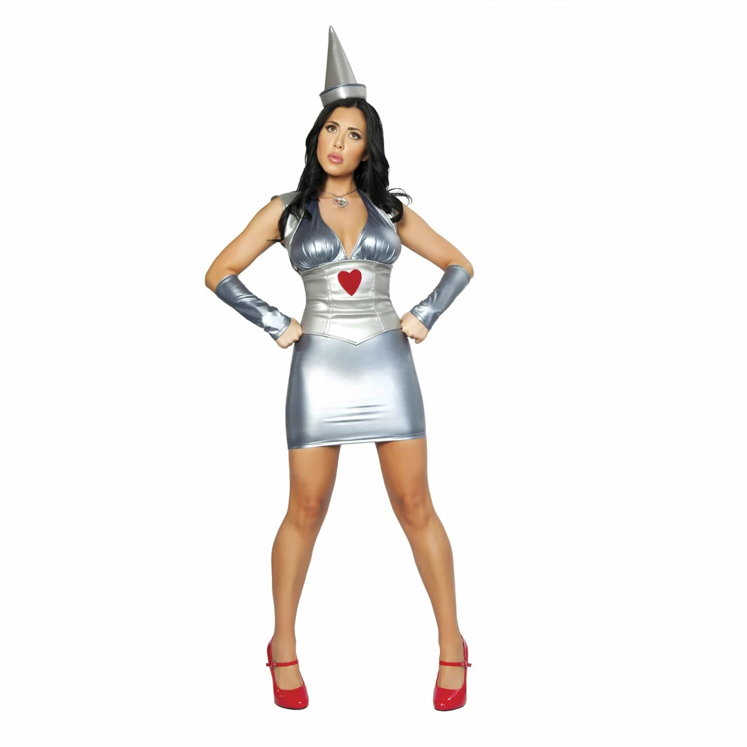Costume includes a halter dress, vest, waist cincher with heart decal, hat and arm pieces.