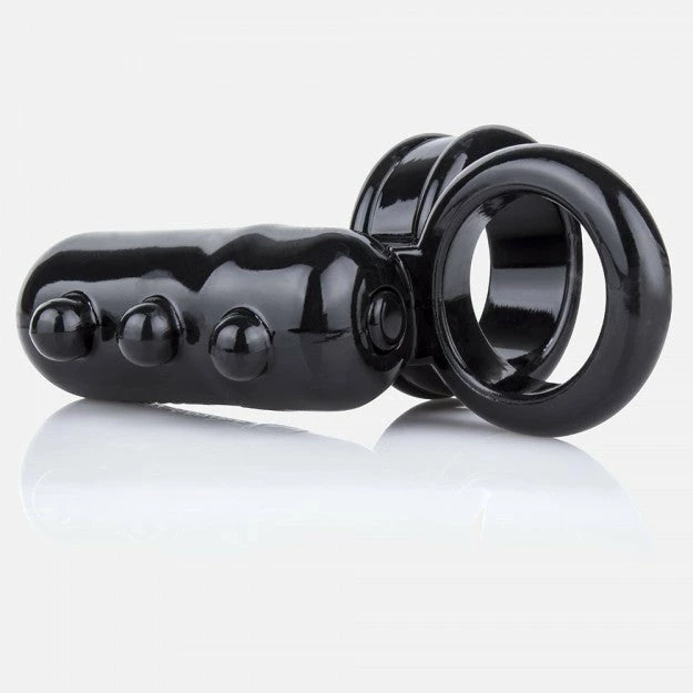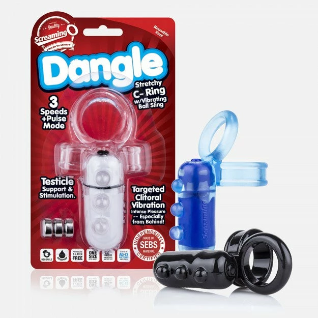 The Dangle is a unique take on a classic vibrating cock ring specially shaped for pleasure during imaginative sex positions – especially ones from behind! The Dangle is powered by a vertical vibrating motor equipped with a stretchy sling that safely hugs the testicles for a pleasantly snug sensation. Simply stretch the top ring around the penis and gently slip both testicles through the sling until you feel a firm and secure hold.