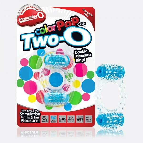 The Two-O Double Pleasure Vibrating Ring features two super-powered, super-bright mini motors attached to a stretchy and comfortable pleasure ring for better, more satisfying sex. The top motor stimulates her clitoris while the bottom motor buzzes strong for mutual pleasure, giving couples something to scream about together! Now available as a convenient ColorPoP Quickie, couples can enjoy vibrant vibration at home or on the go with a disposable design they can take anywhere!