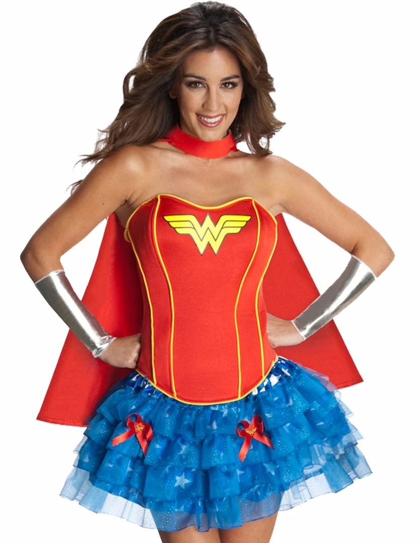 Spin spin spin and turn into Wonder Woman! This four-piece costume features a corset with Wonder Woman logo front detail, yellow trim piping to flatter all body types, a ruffle chiffon skirt with red ribbon detail, cape, and silver gauntlet sleeves. You’re truly a wonder! Shoes not included.
