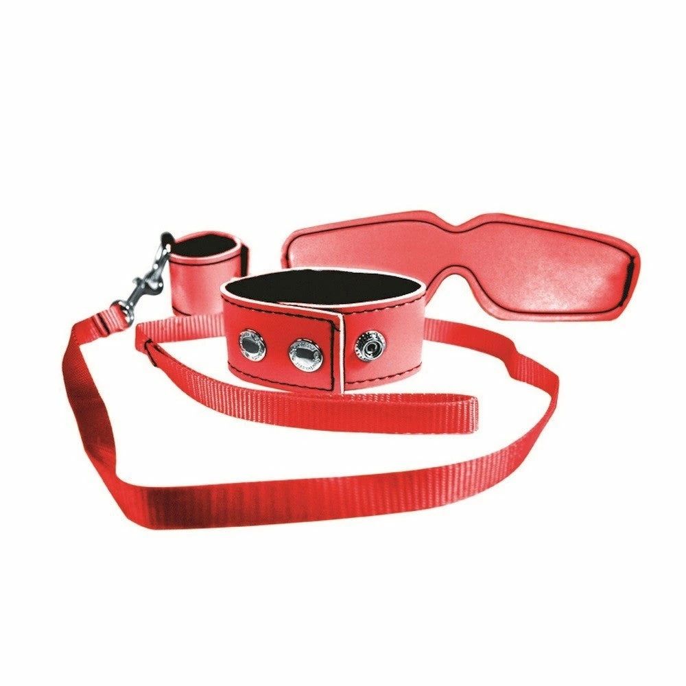 Kit Includes: 2 faux leather wrist cuffs that convert to a collar. 1 faux leather blindfold. 1 nylon leash that coverts to a 38 inch tether.