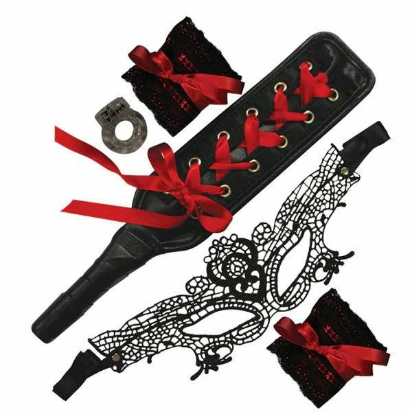 Masked Desires Kit Includes: Lace Mask, Satin and Lace Cuffs, Pretty Punisher Paddle, Vibrating Cock Ring. Materials: Polyester, Polyurethane Fabric, Polyurethane Foam, Fiberglass, Nickel Free Metal Hardware, Galvanized Steel, Thermoplastic Rubber Tpr, Abs Plastic, Button Battery. Ce Registered Vibrator.