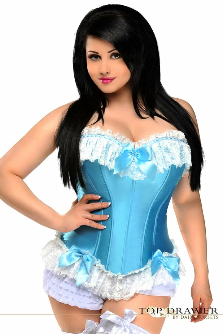 Strapless corset with ruffled edges, side zipper closure, lace-up back, removable and adjustable garters, and matching thong.