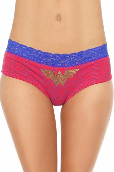 All over wonder woman symbol with a big golden foil emblem in front. Lace blue trim and flattering fit.Â